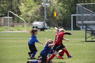 I was so proud of her. She got in there and held her own. Wasn't afraid. Didn't cry. She paid attention. She actually kicked/dribbled the ball. Last week she told me that she couldn't actually go after the ball in the game because "she was too shy". Guess she's getting over her shyness. :)